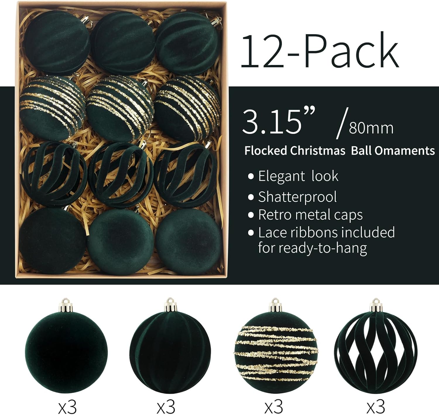 Christmas Ornaments Set of 12, 3.15" Flocked Velvet Balls with Hand Painted Designs,Emerald Green Elegant Christmas Tree Decorations in Gift Box