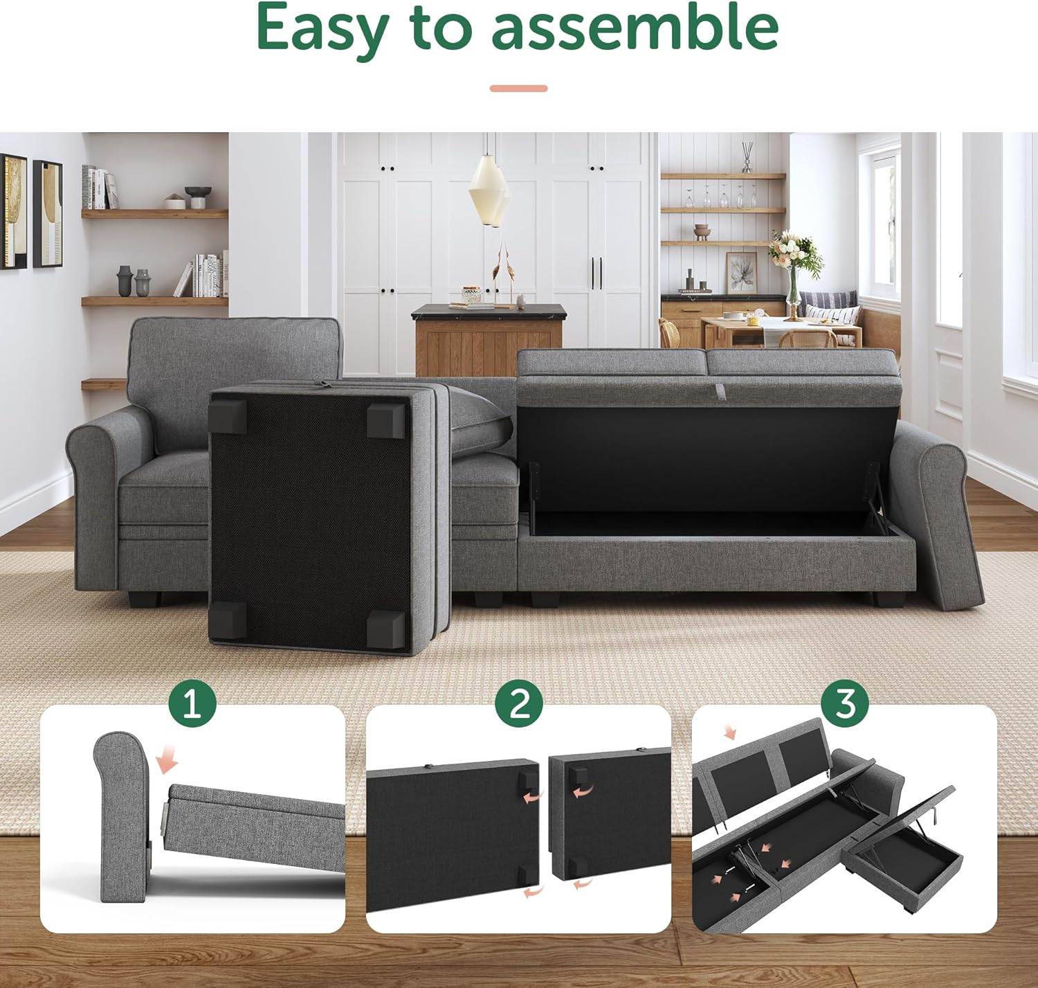 - Spacious Sofa:This Storage sectional sofa is made with a sturdy solid wood frame and cushions filled with high-density sponge and wrapped in 100% linen fabric