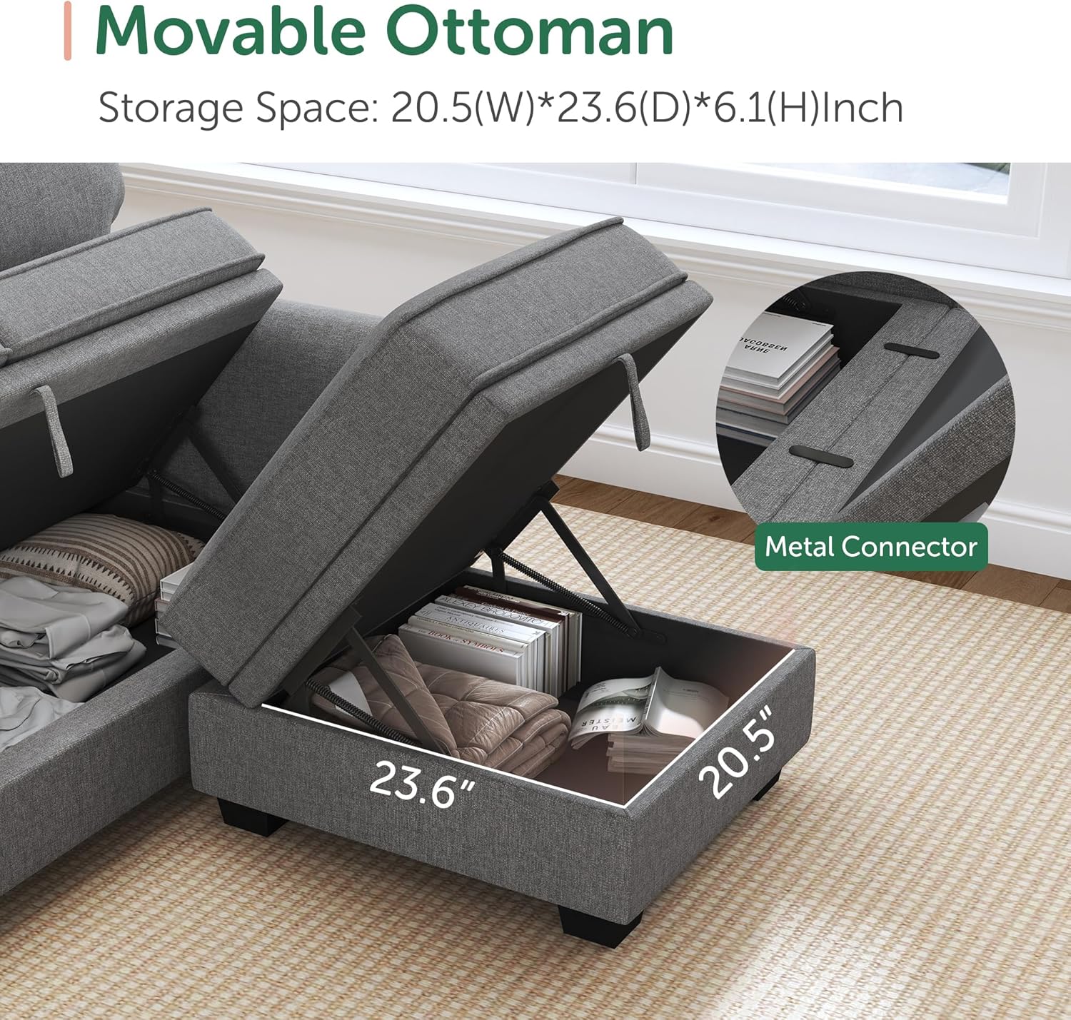 - Movable Ottoman: The Sectional sofa is composed of a 4 seat sofa, 2 movable small ottoman and a big ottoman. Ottomans can be connected to the 4 seat sofa by connecting pieces to form a U shaped sofa or a sofa bed. Ottomans can also be placed individually according to your needs