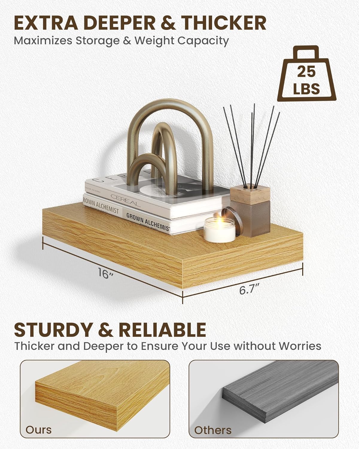 Marsmiles 16" Floating Shelves for Wall, Wooden Shelves with Invisible Brackets Set of 2, Rustic Farmhouse Wall Mounted Shelf for Kitchen Bathroom Living Room Study, Natural Oak
