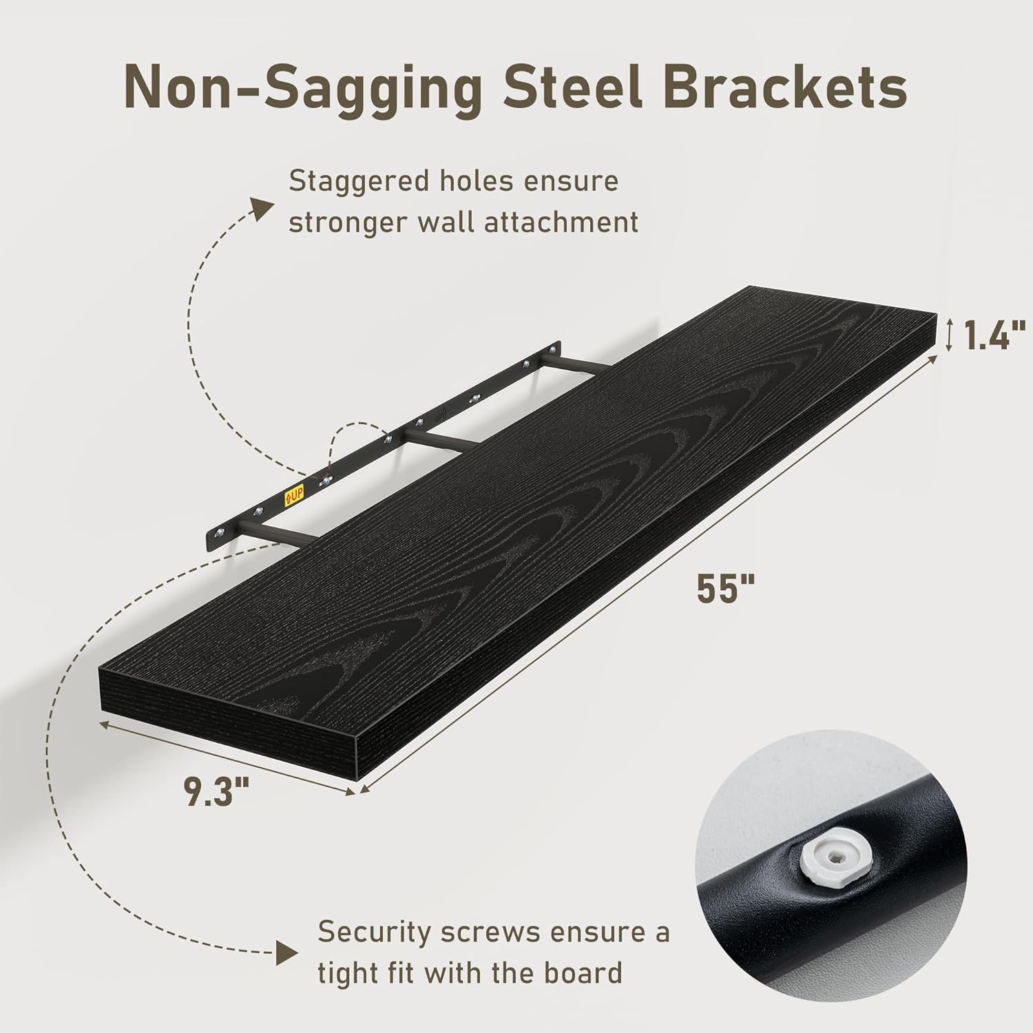 Fun Memories 55 Inch Floating Shelves for Wall 2 Pack Shelves for Bedroom|Kitchen|Bathroom 55 x 9.3 Inch Wood Floating Shelf with Invisible Brackets for Books|Storage|Decor, Black