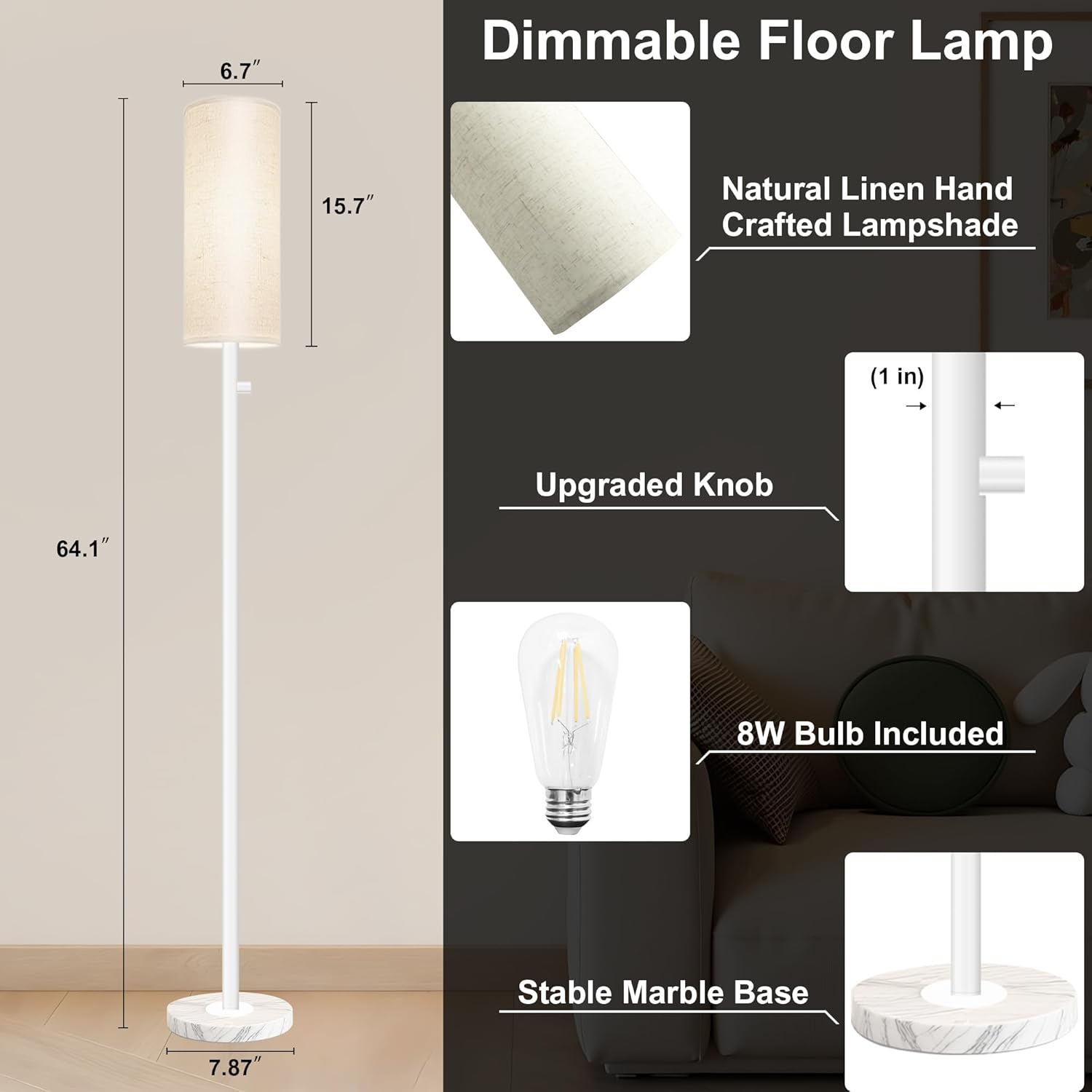 • Stable Marble Base & Space-Saving Design: Our modern tall standing lamp features a high-quality marble base for enhanced stability and added safety. This compact tall lamp fits easily in any corner or beside furniture—ideal for kids' rooms, next to bedside tables, office desks, nightstands, or sofas.