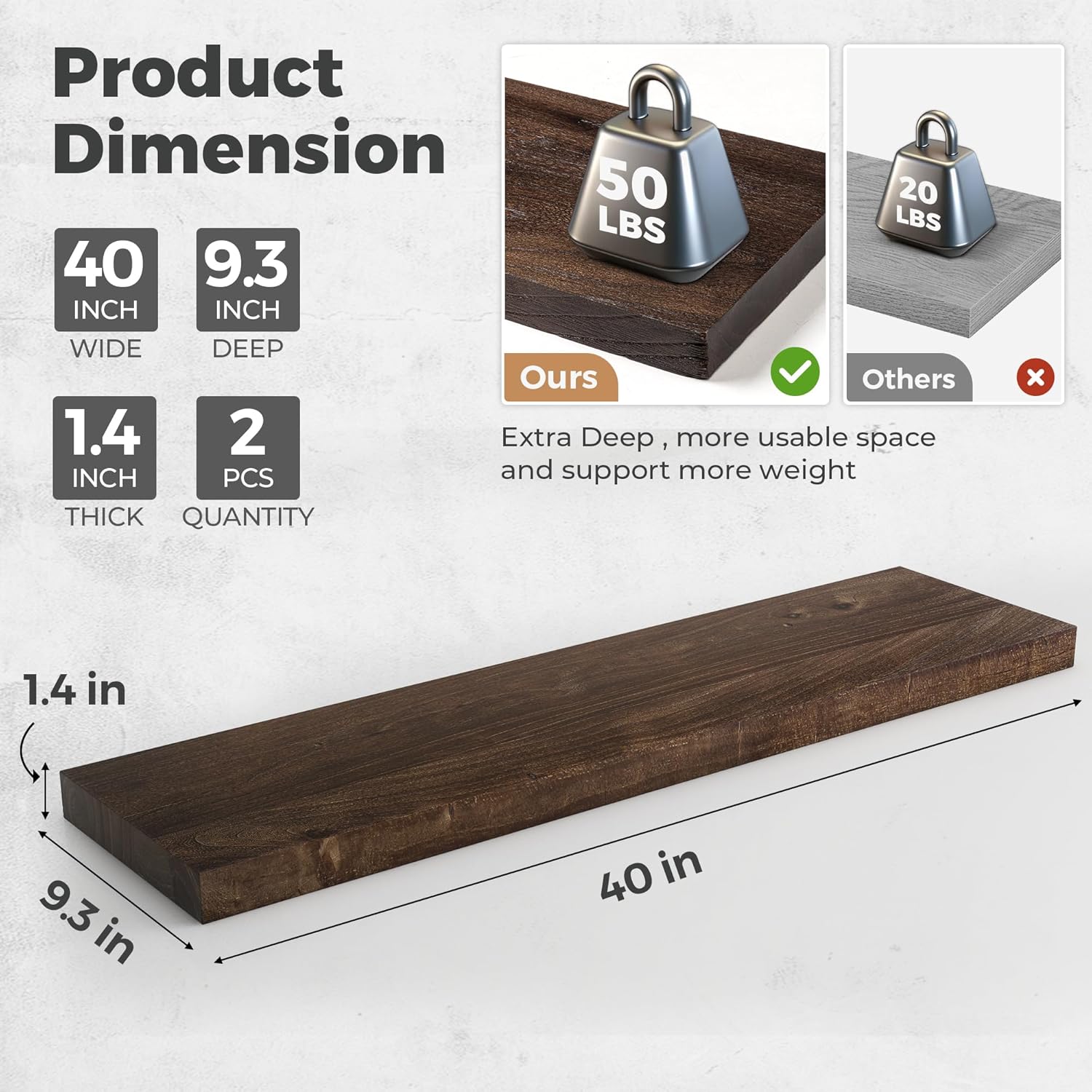- 9.3" DEEP-MORE SPACE&MORE TIDINESS: Measuring 9.3 inches deep and 1.4 inches thick, the floating wood shelves perfect for various scenes and have a strong storage capacity, from books and photos to small plants. Perfect for any room in your home, including living rooms, offices, kitchens, and more