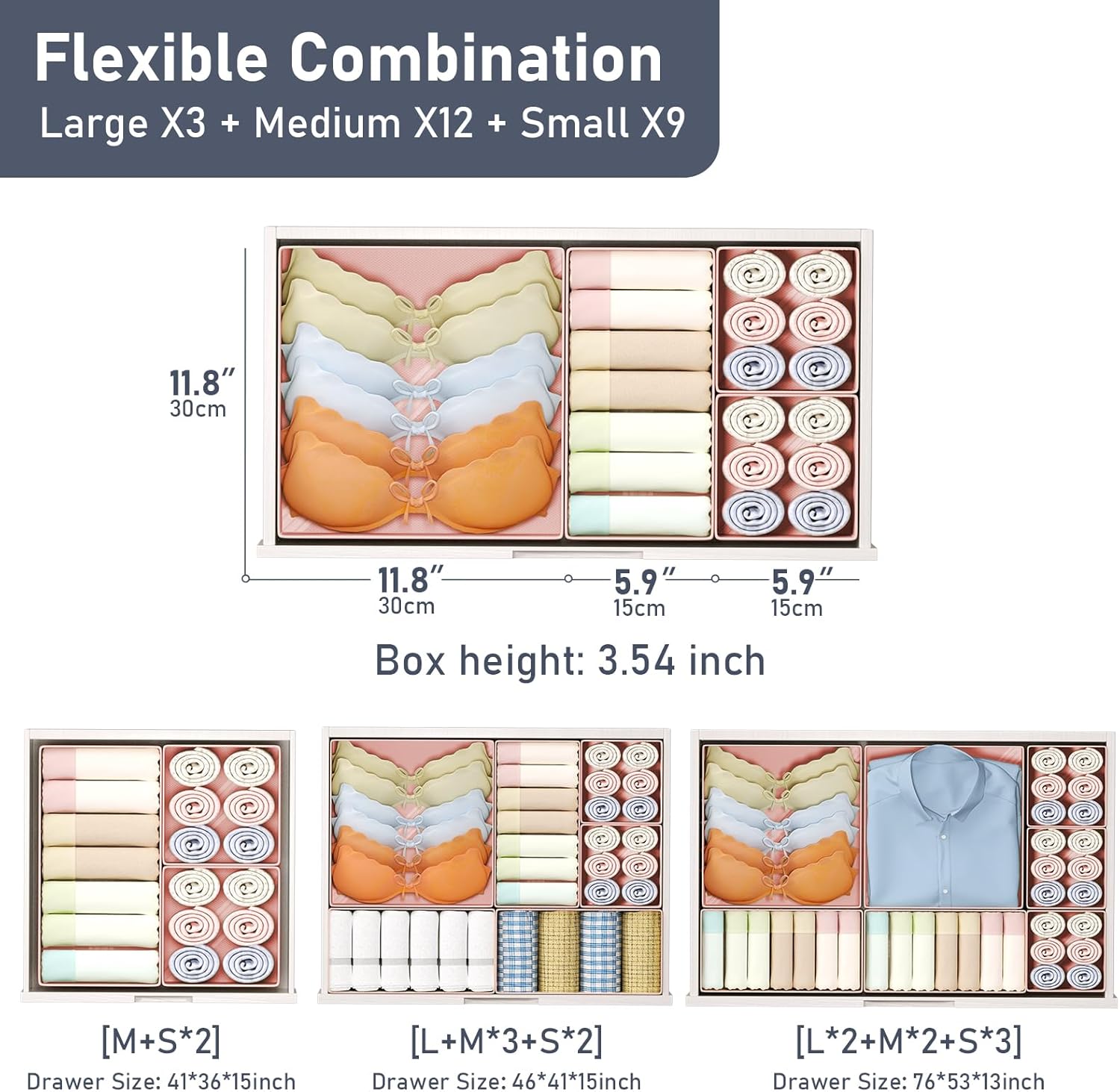 - [Perfectly matching your drawers] : This clothes organizer set includes 15 storage bins in various sizes to fit all your needs: 3 large (11.8*11.8*3.54"), 12 medium (11.8*5.9*3.54"), and 9 small (5.9*5.9*3.54"). Great for organizing clothes, sock, underwear, bra, baby clothing, scarves, shirt, pants, belt, ties, bikini and more