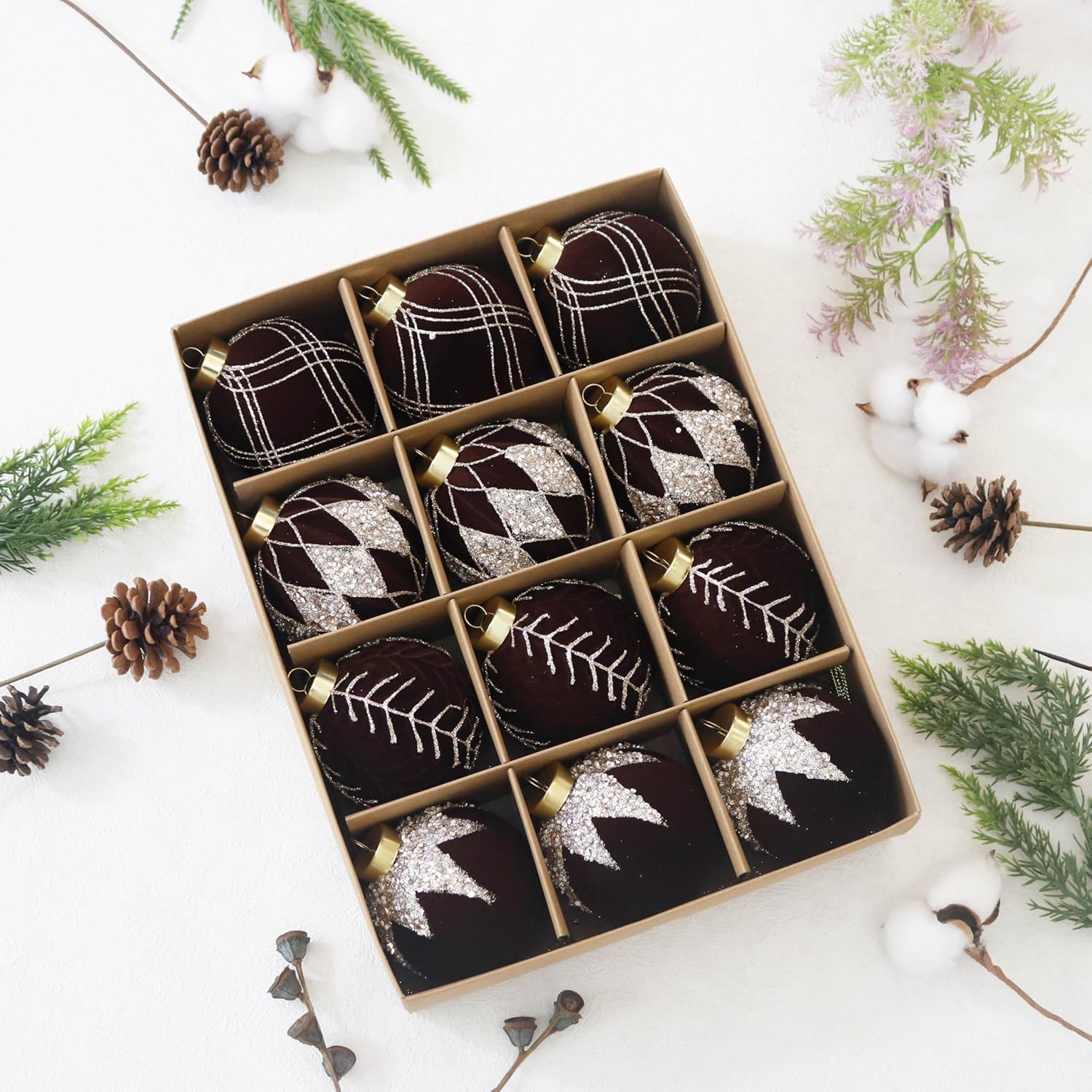 3.15INCH Brown Velvet Ornaments for Christmas Tree, 12PCS Glitter Flocked Christmas Ornaments Decorations Balls Set Decor
