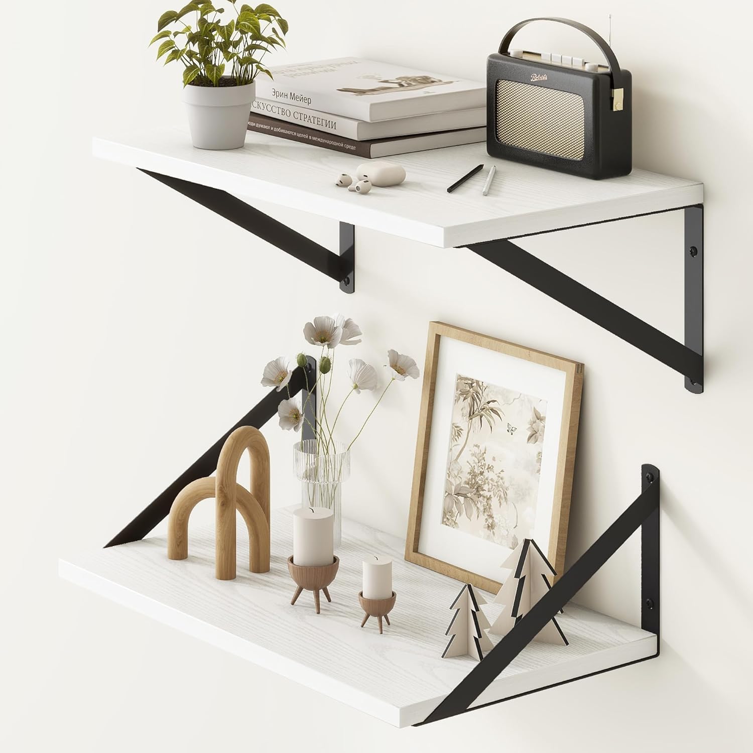 - ăDECORATIVE & FUNCTIONALăThe wall-mounted floating shelves are designed for decoration and storage, utilizing and decorating any space in your home. Used as shelf decor to show your collection, books, or prize, the hanging shelves are perfect for displaying your photo frame, small plants, model, or audio in your living room, office, study. And can also use as over the toilet storage shelf in the bathroom to hold toiletries or used as kitchen shelf to storage condiments.