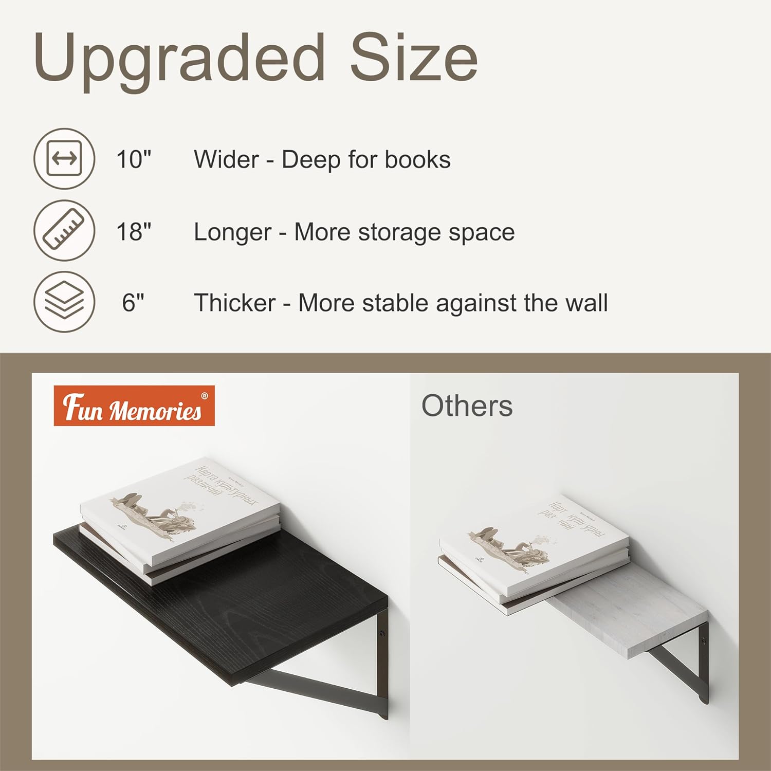 - ă10 INCH DEEP FLOATING SHELFăThis extra deeper and wider wall shelves are 10 inches in depth and 18 inches in length instead of the regular narrow floating shelves, you can put photos, pictures, DVD players, videos, books, toys, and some other knickknack on this beautiful display wooden shelf.