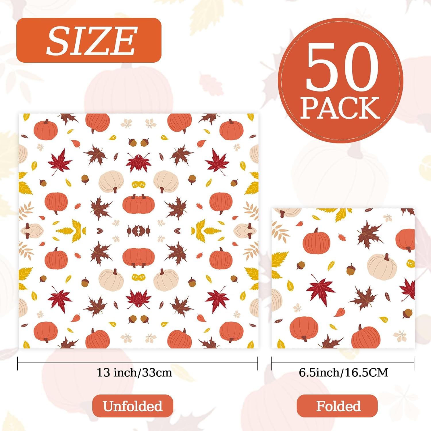 - 🌽Package Includes: This package contains 50 pieces of fall-themed paper luncheon napkins. The elegant autumn patterns, featuring pumpkins and leaves, bring a festive touch to your gatherings while providing ample quantity for your needs.