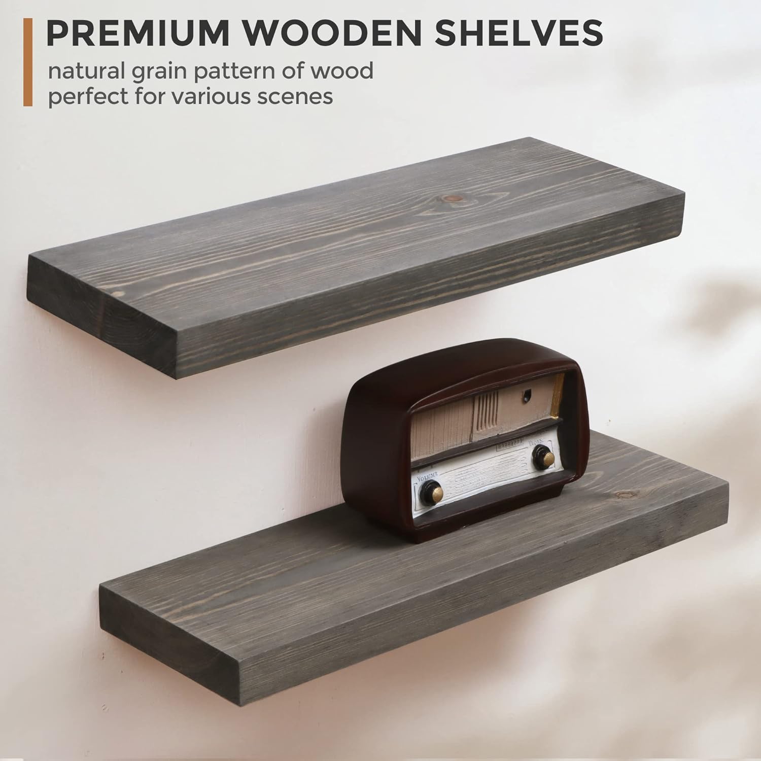 Fun Memories European Pine Floating Shelves for Wall, Mounted Shelf for Decor Storage Set of 2 - Natural Rustic Wooden Wall Shelf for Kitchen Bathroom Living Room Bedroom Farmhouse - Grey