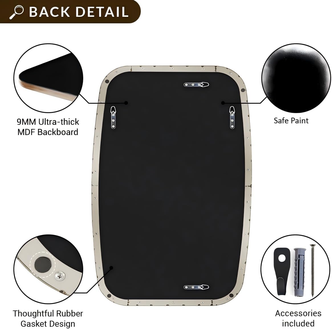 • Premium Quality: Crafted from heavy-duty SUS304 stainless steel, this oval mirror is sturdy, durable, anti-scratch, and rustproof; The no-distortion HD glass provides clear reflections; the MDF backboard ensures safety and strength against humidity