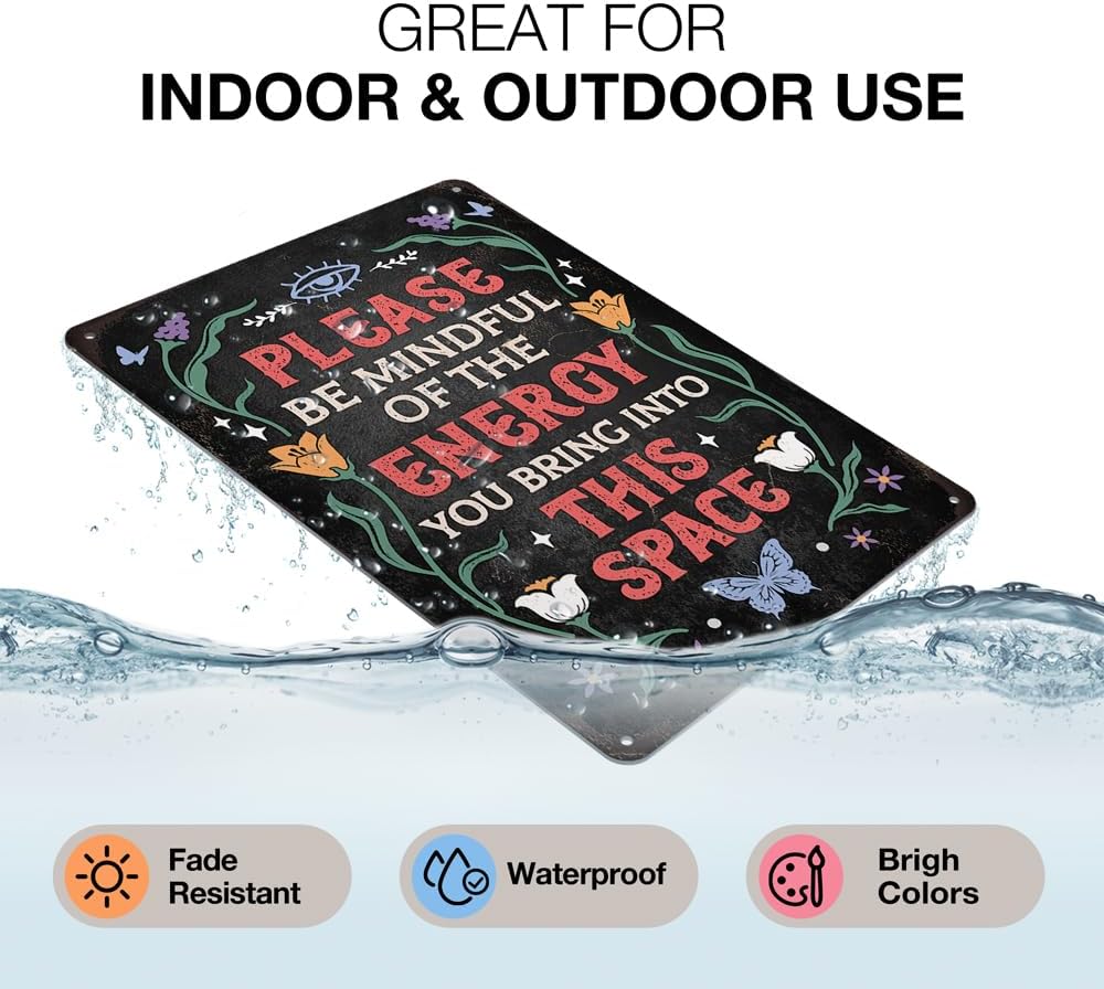 Heuhuww Vintage Positive Energy Metal Sign-Please Be Mindful of the Energy You Bring Into This Space Wall Decor for Home Yoga Cafes Bedroom Good Vibes Only Sign 8"x12"(H25)