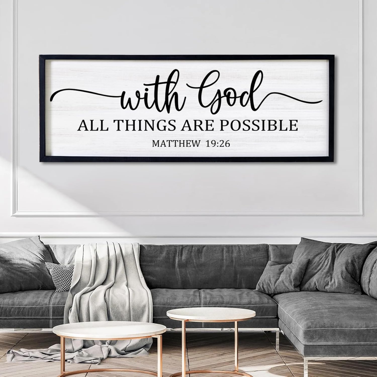 With God All Things are Possible Framed Wall Art, 40''×15'' Black Positive Religious Rustic Bible Verse for Christian God Jesus Christ Prayer, Holy Horizontal Inspirational Catholic Scripture Decor