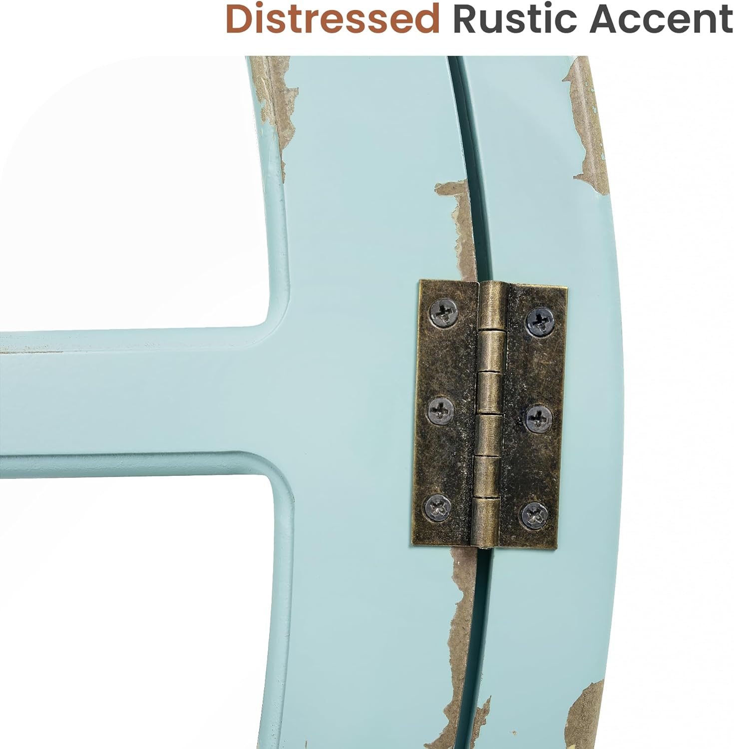 30" Round Window Mirror, Vintage Coastal Wall Mirror with Distressed Blue Wood Frame & Faux Windowpanes, Farmhouse Cottagecore Decor for Living Room, Entryway, or Dining Room