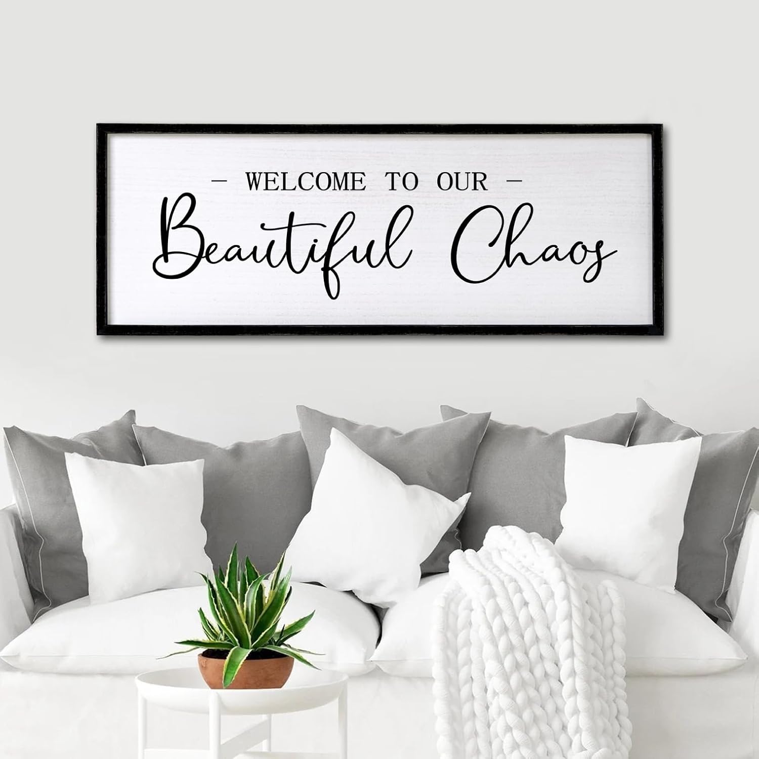 Welcome to Beautiful Chaos Framed Wall Art, 40''×15'' Rustic Horizontal Beautiful Chaos Plaque with Black Frame for Entryway Living Room, Farmhouse Long Welcome to our Chaos Wood Sign Wall Decor