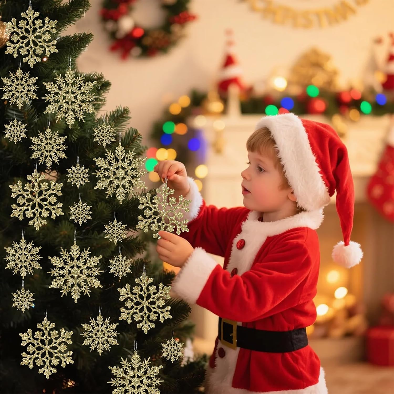 - Glitter Gold Snowflakes:Our Christmas snowflake features a dazzling combination of golden glitter and sequins—the glitter casts a soft, golden glow like morning mist, while the sequins sparkle with diamond-cut brilliance. When illuminated by Christmas tree lights, these sparkling gold snowflakes create a dazzling spectacle, making them perfect for "filling out" your tree with glamour