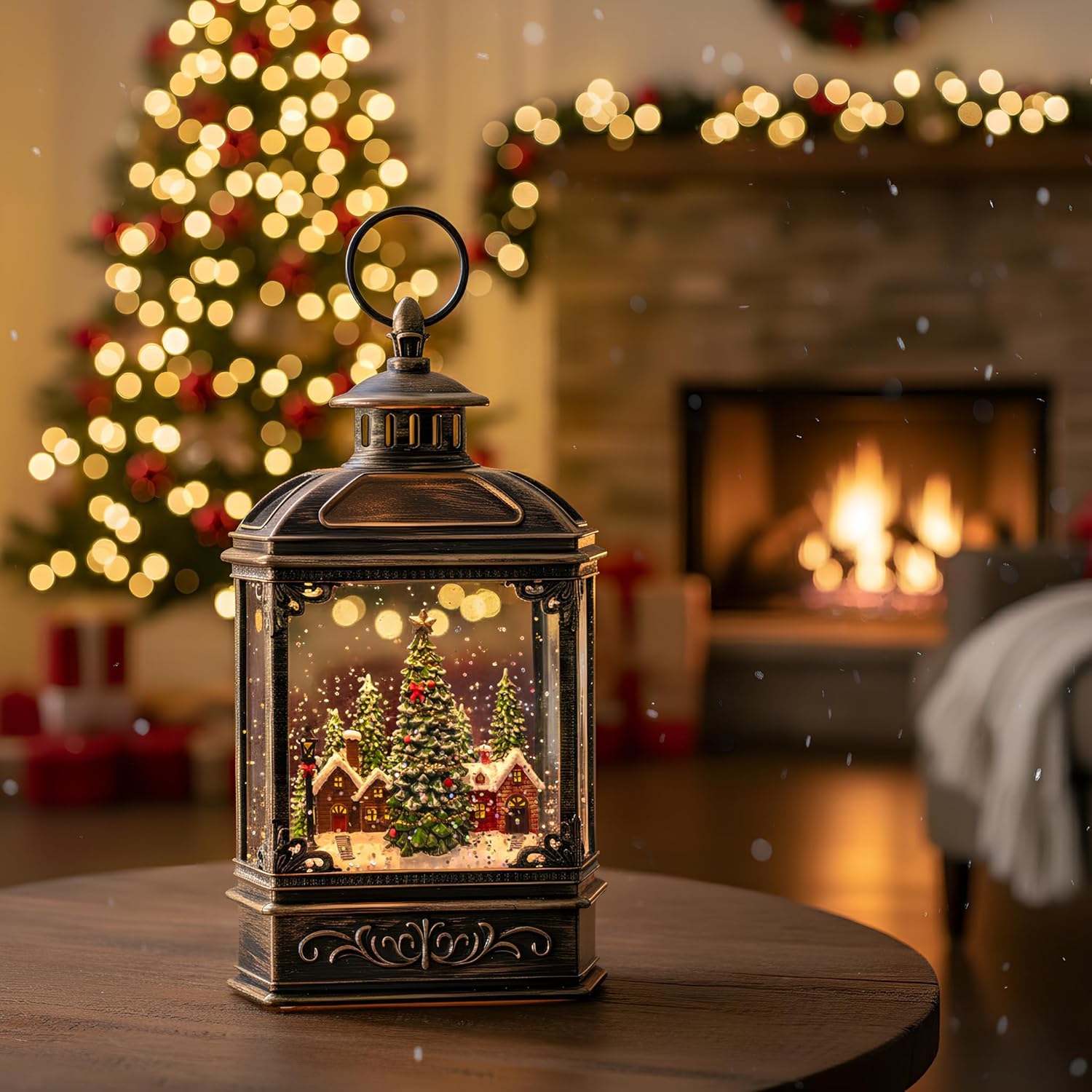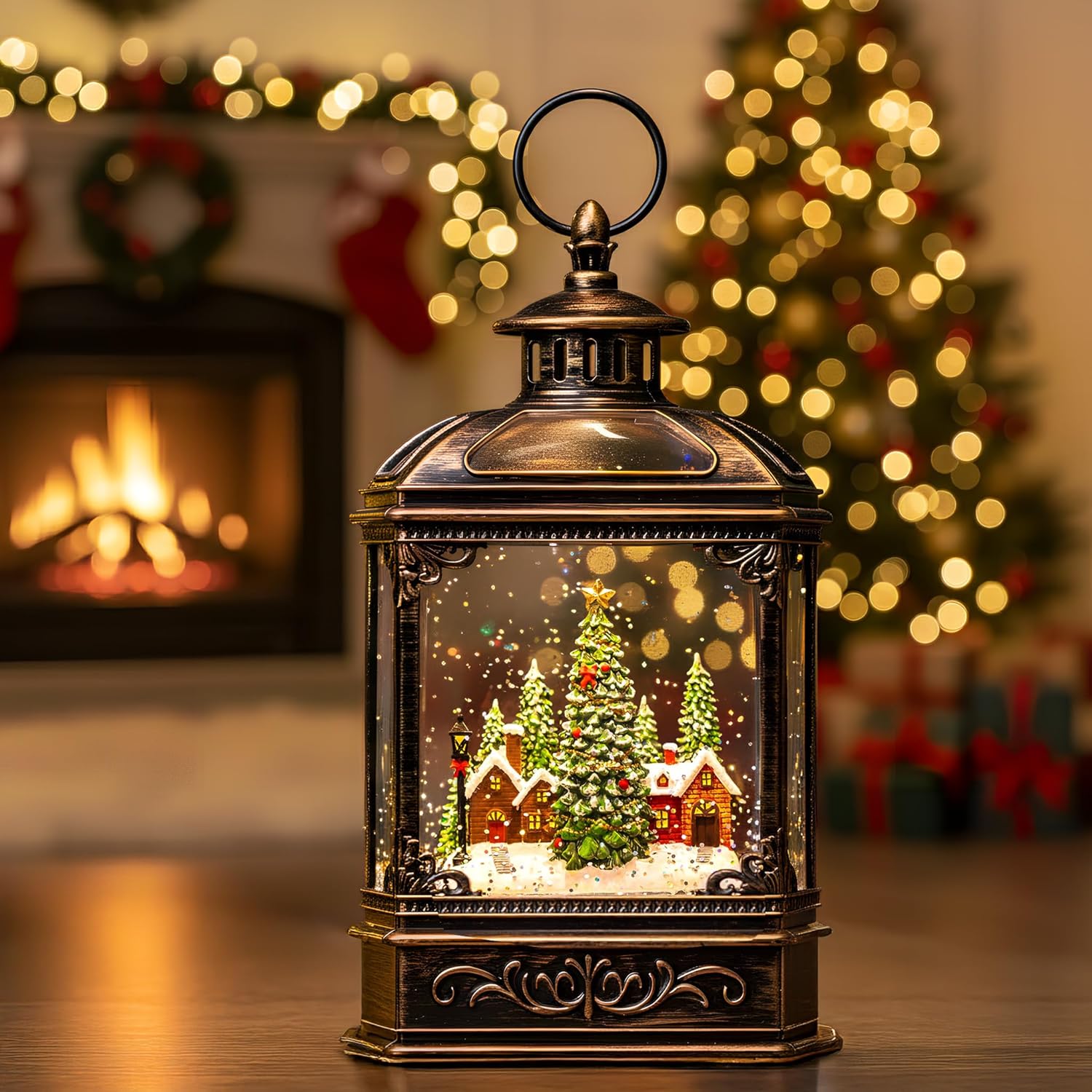 - 🎅🎄【Holiday Village Figurines Water Lantern】This snow globe lantern lighted christmas village scene. Snowy mountain village with colorful houses, and a church with a steeple. When turned on a warm LED shines on the figurine and swirling glitter to gives our Christmas globe a whimsical look for the Christmas Holiday season.