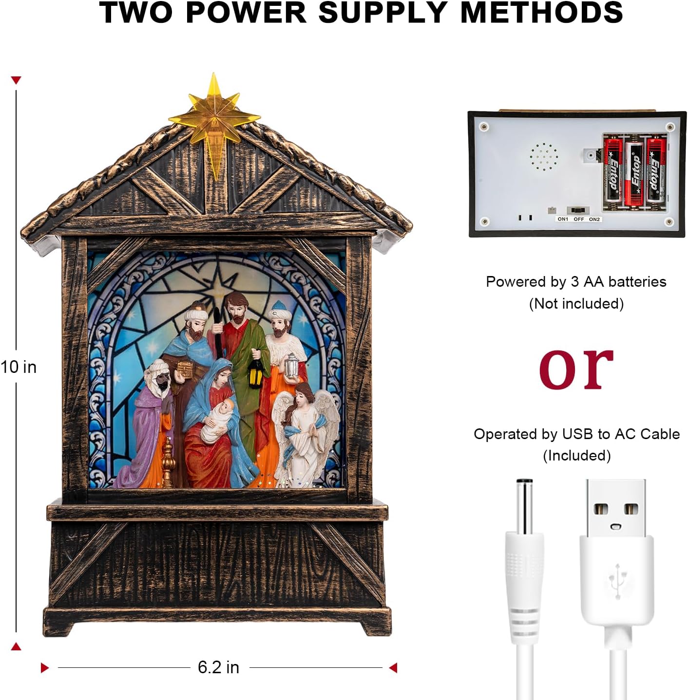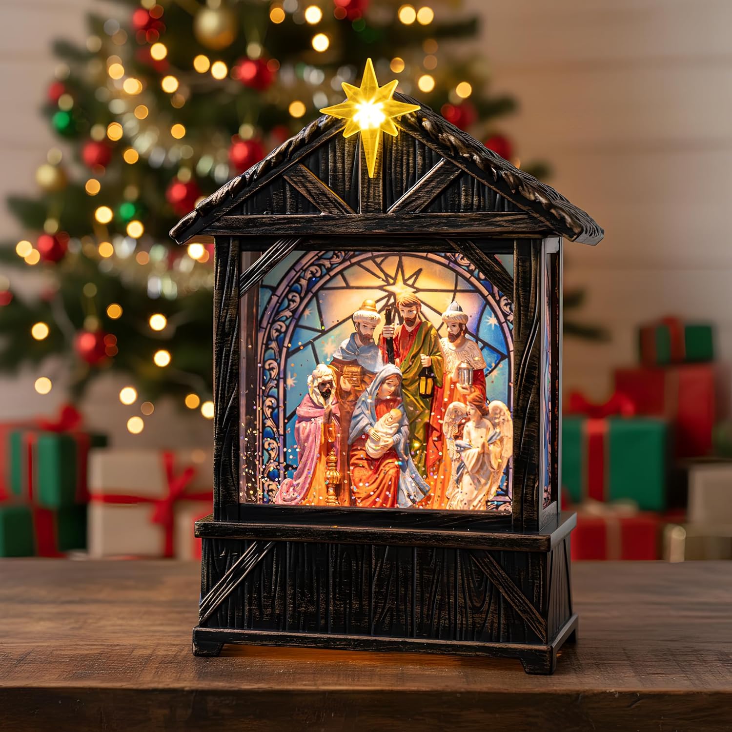 - 🌟【Nativity Figurines Manger】A traditional Nativity scene with Star musical water Creche. Nativity Scene Water Lantern features serene blue tones that enhance its peaceful ambiance, it brings a timeless holiday story to life. When turned on a warm LED shines on the figurine and swirling glitter to gives our Christmas globe a whimsical look for the Christmas Holiday season.