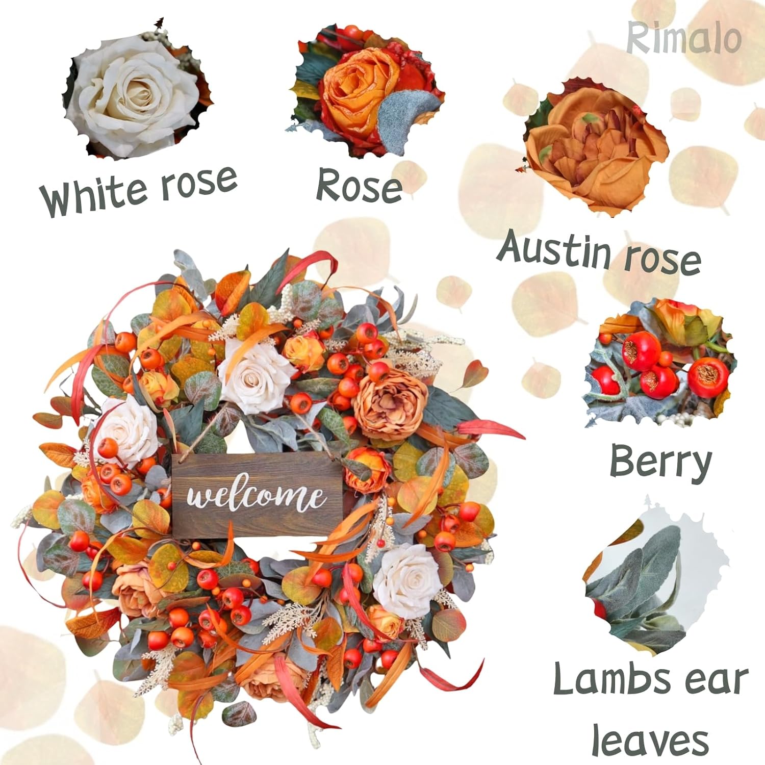 - đăLifelike Fall Wreath with Roses & Lambâs Ear LeavesăThis Fall Wreath for Front Door is filled with seasonal charm, featuring a thoughtful combination of lambâs ear leaves, white roses, Austen roses, dried roses, poppy berries, eucalyptus leaves, grain ears, berries, and willow leaves. With soft, rich tones and realistic textures, this 24 inch fall wreath brings a refined and romantic harvest vibe to any space.