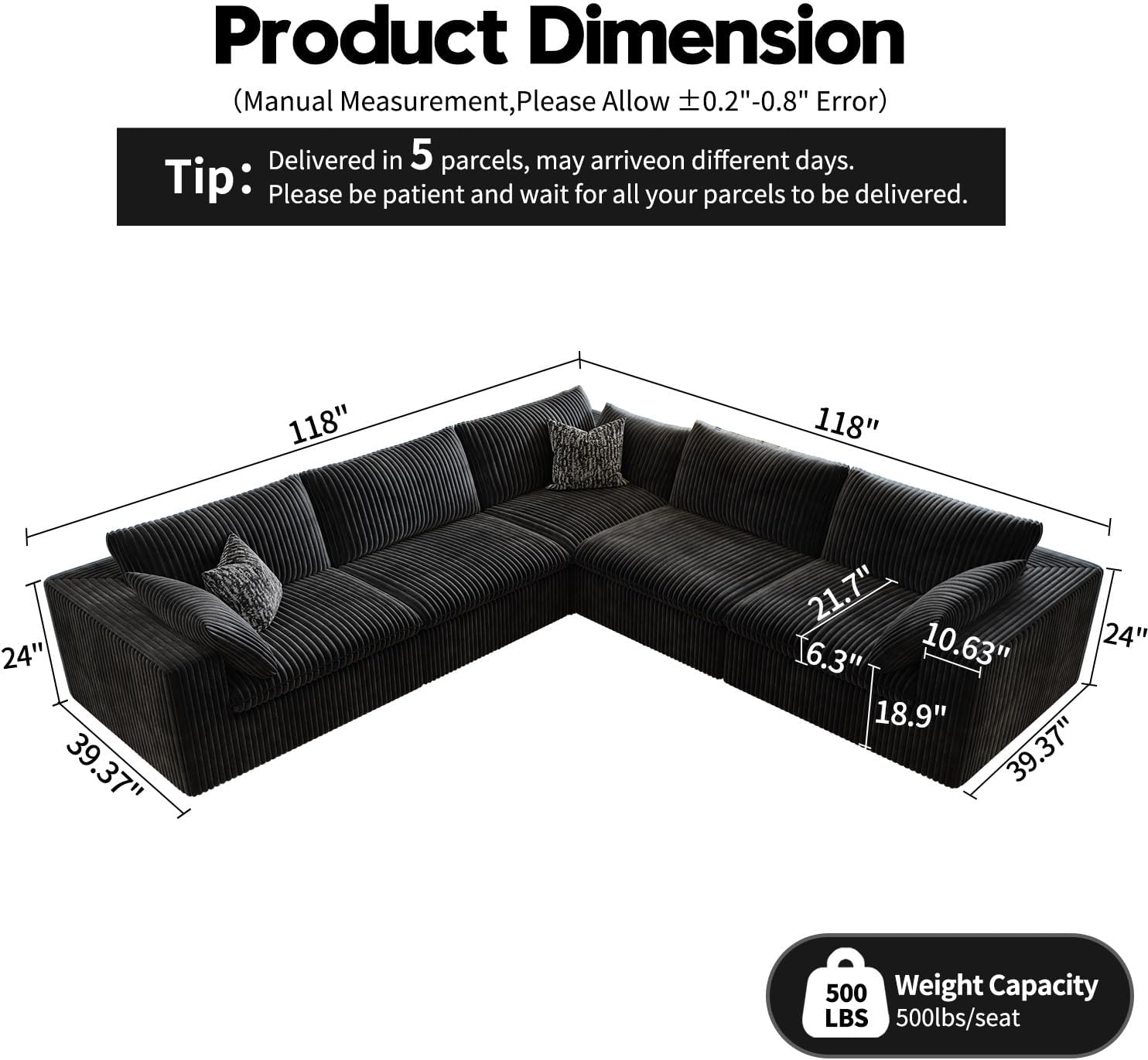 118" Cloud Couch Oversized Modular Sectional Sofa for Living Room,Modern Sofa with Deep Seat,V Shaped Boneless Couch,Comfy Upholstered Corduroy Couches for Apartment, Studio, Office,Bedroom,Black