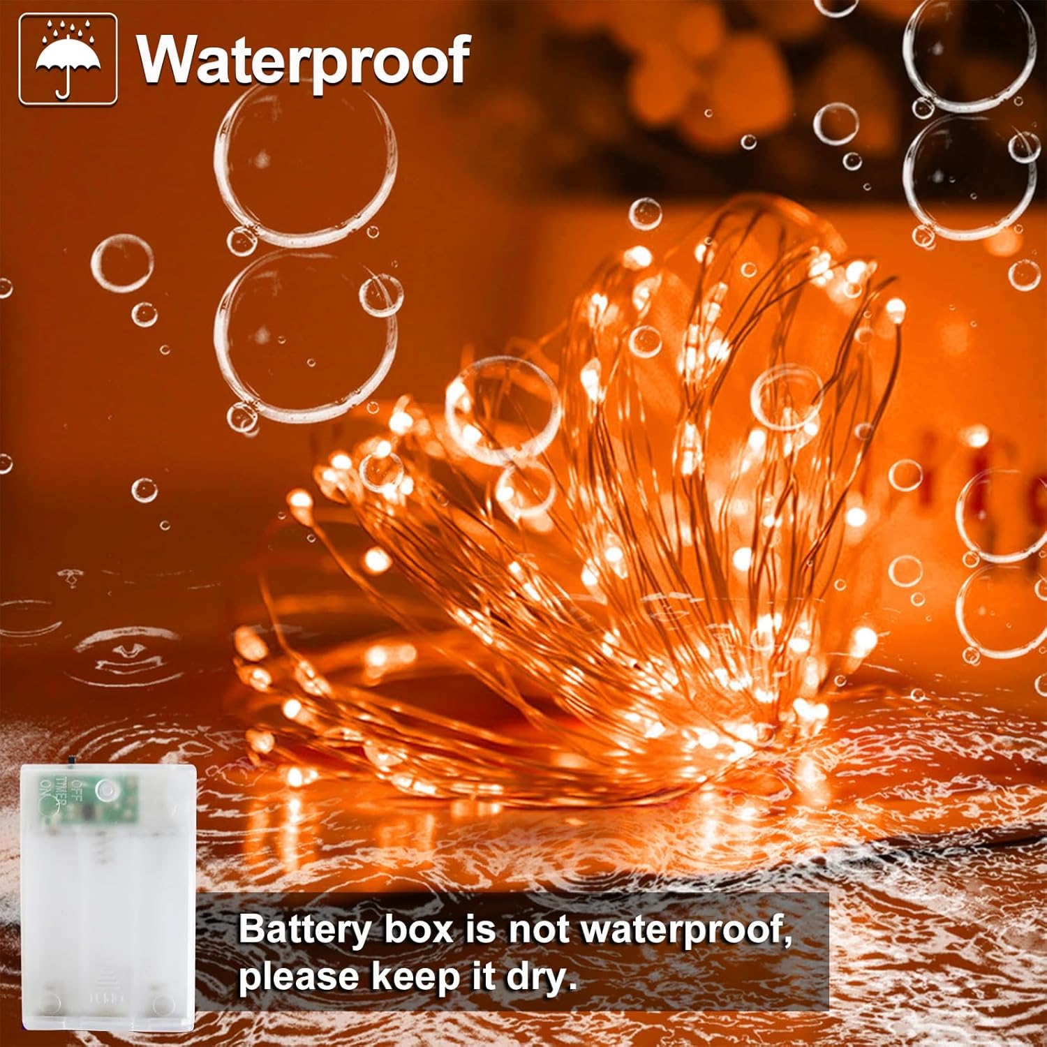 - Waterproof Design: IP65 waterproof rating allows indoor and outdoor use without worry of moisture or weather damage.Battery box is not waterproof,keep it dry.