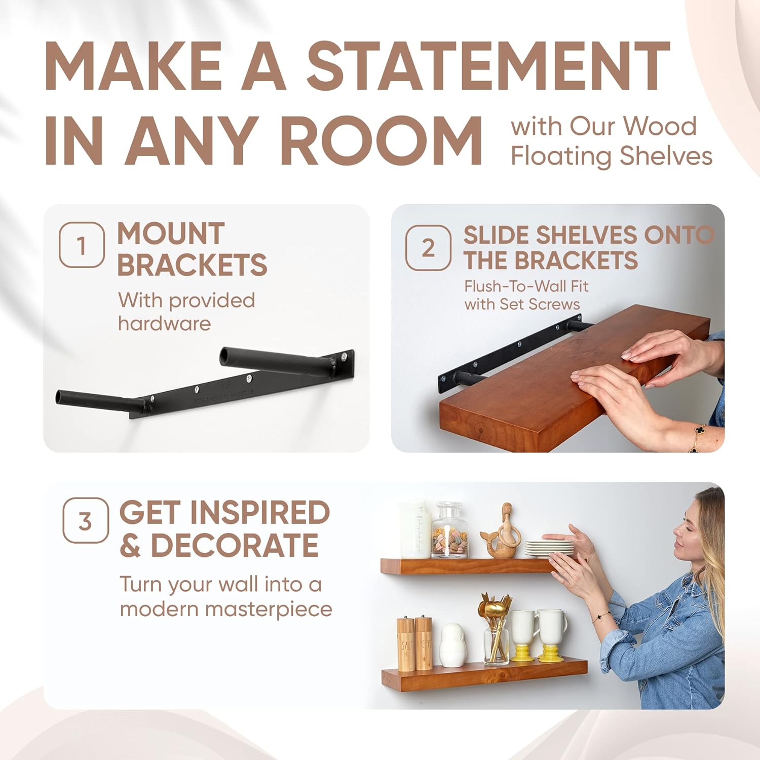 • AUTHENTIC WOOD GRAIN - Enjoy the timeless elegance of real wood. Handcrafted from the finest 1.75" Thick natural pine wood measuring 24" Wide x 6.5" Deep x 1.75". Our shelves highlight the inherent charm and durability of high-quality wood. Each Shelf reveals its unique character of knots and natural wood grain; each ledge is a little different but equally stunning.