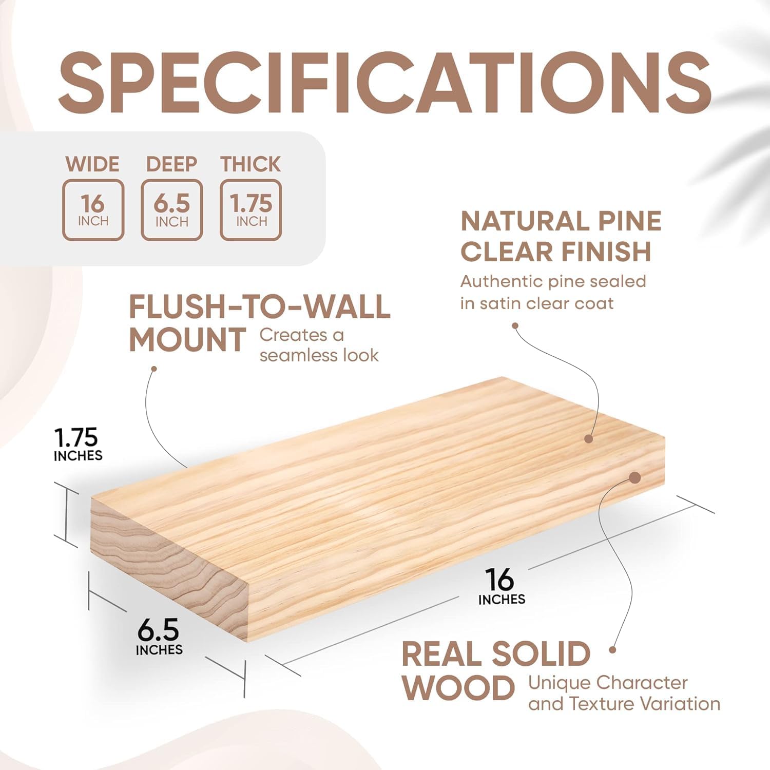 • AUTHENTIC WOOD GRAIN - Enjoy the timeless elegance of real wood. Handcrafted from the finest 1.75" Thick natural pine wood measuring 16" Wide x 6.5" Deep x 1.75". Our shelves highlight the inherent charm and durability of high-quality wood. Each Shelf reveals its unique character of knots and natural wood grain; each ledge is a little different but equally stunning.