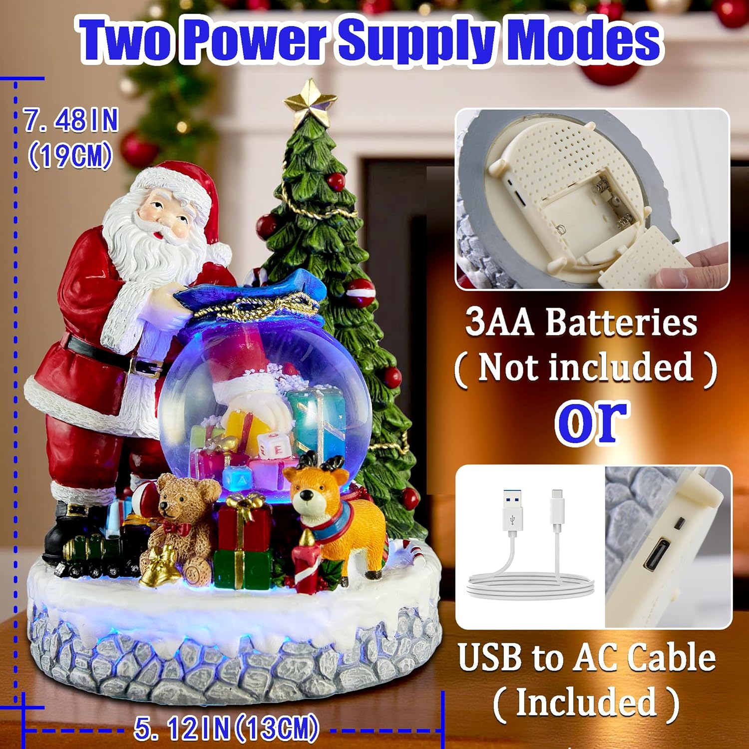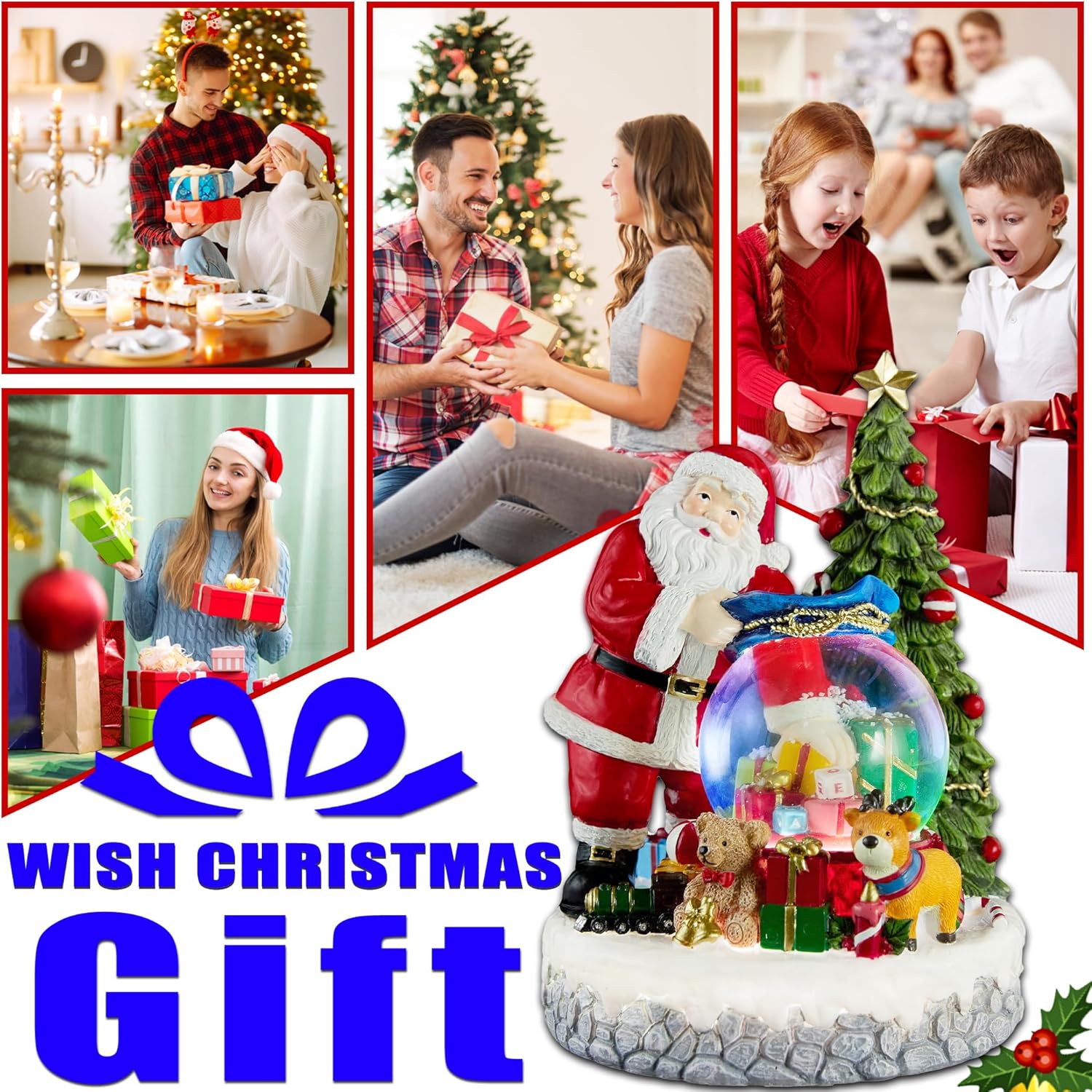 - 🎄☃️【 Exclusive Design 】This Christmas tree is made of high-quality resin materials and exquisitely crafted. It features rich Christmas elements such as Santa Claus holding gifts, reindeer, Christmas trees, teddy bears, and bells. In the middle is a crystal-clear snowflake glass ball with a pile of glittering gifts inside. This is a unique product in the market. The snow globe has two modes: when the switch is turned on, mode one is "light on". After clicking the switch, Mode Two is "Light on + Music".