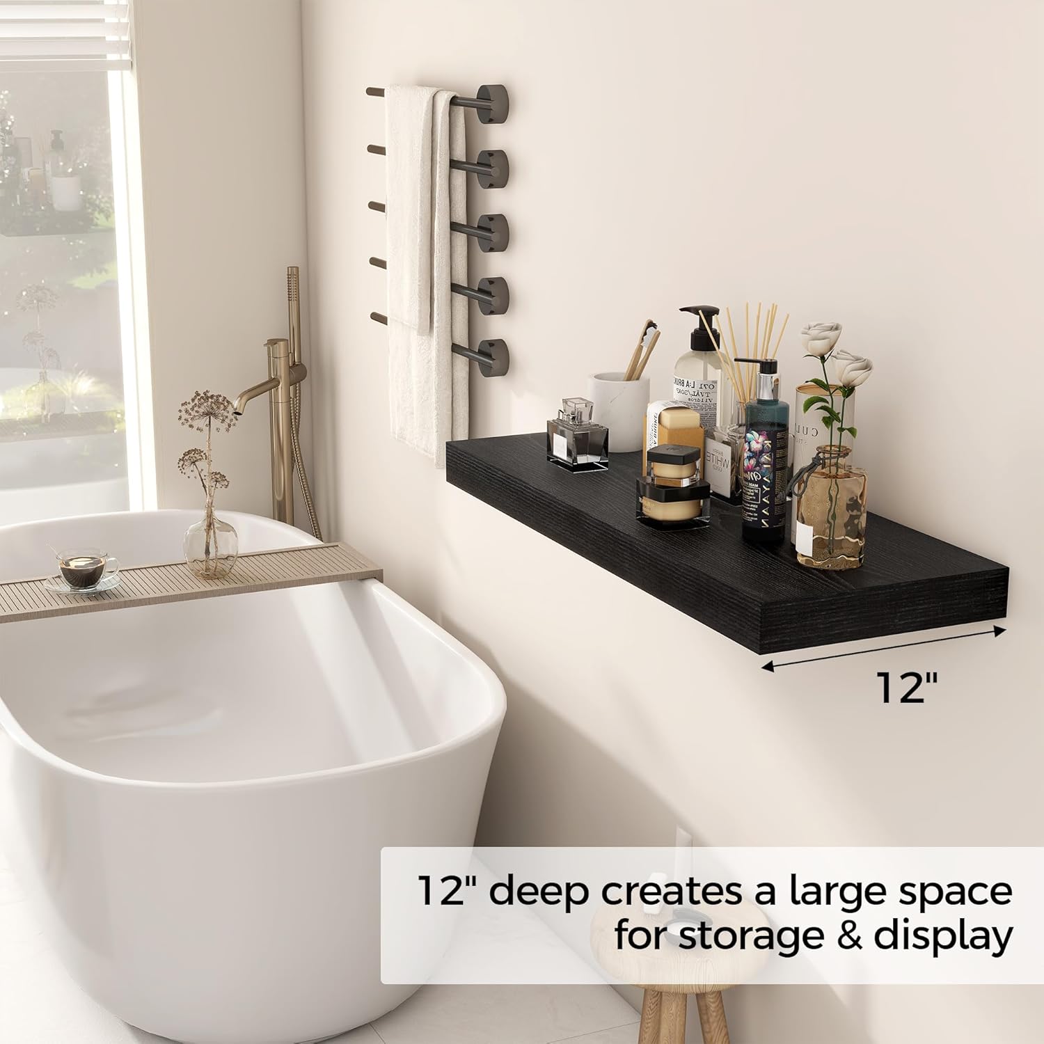 Fun Memories Black Floating Shelves 30" W x 12" D, 12 Inch Deep Floating Shelf for Books, Bathroom, Living Room, Rustic Wood Wall Shelves, 2 Inch Thicked Storage Shelf for Home Storage, Set of 2