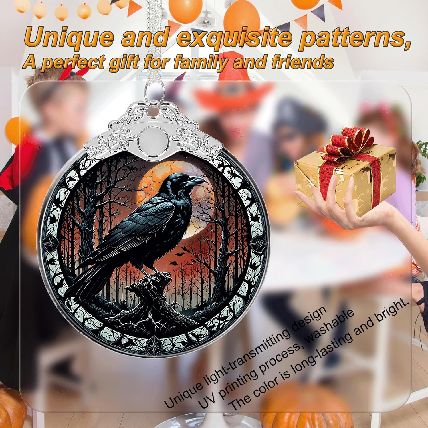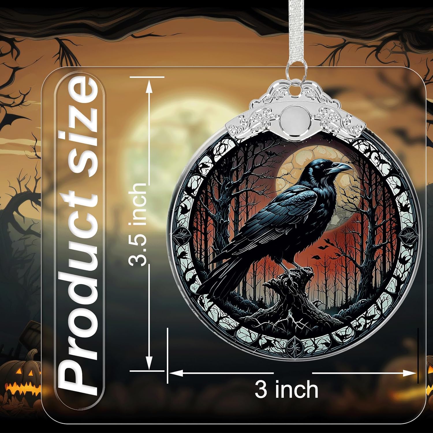 Crow Under Moonlight Halloween Christmas Tree Stained Glass Ornament - Hanging Ornaments for Christmas Tree Decorations - Holiday Keepsake Present Exchange Idea