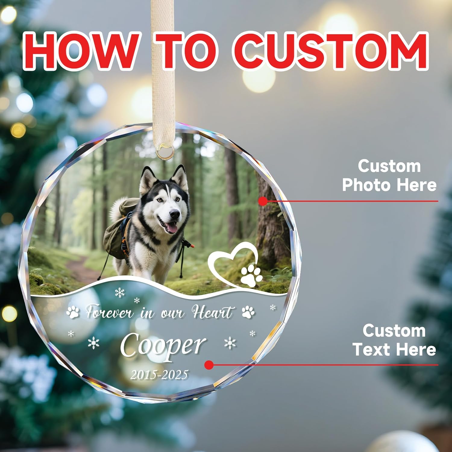 - CUSTOMIZED PET MEMORIAL ORNAMENT: Personalize a tribute to your furry friend with a custom ornament featuring their photo, name, and years. Create a unique keepsake honoring the special moments shared with your beloved pet.
