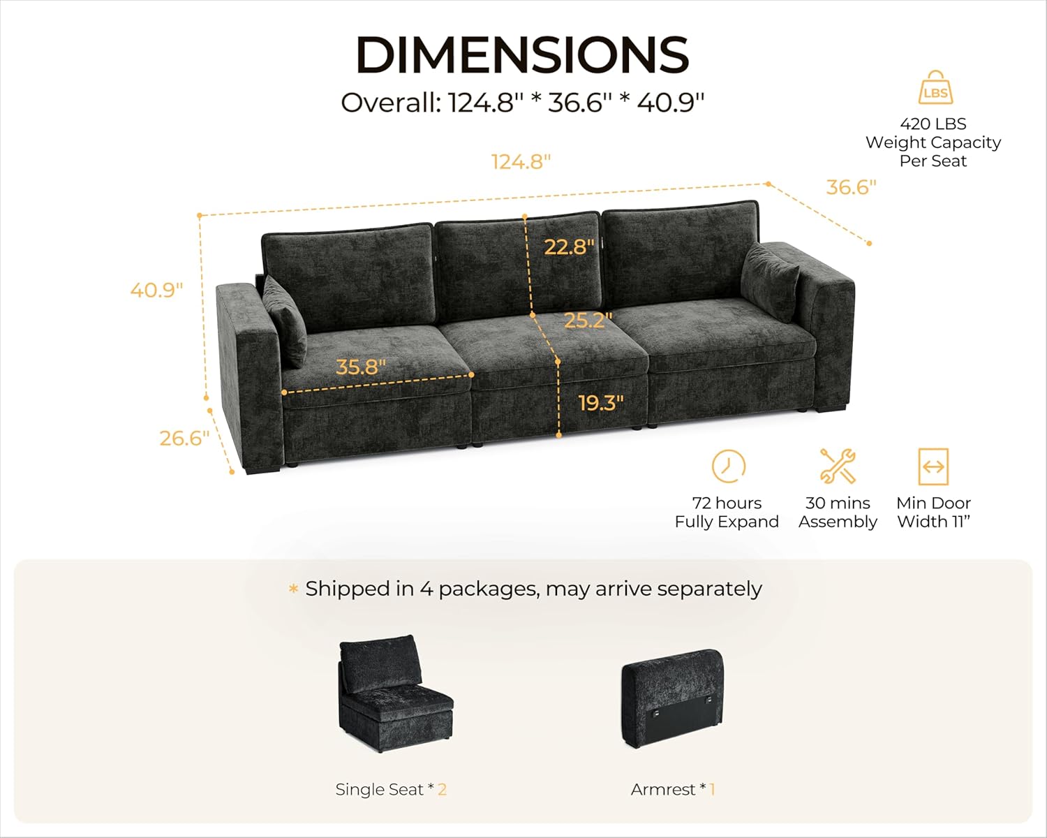 - ăMultiple Packages & Dedicated Supportă Your cloud modular sectional couch ships in 4 separate packages, which may arrive at different times. If you receive only some boxes, donât worryâmore are on the way! Need additional tracking details or assistance? Weâre happy to helpâjust reach out! Our team is here to ensure you receive everything as expected and guarantee a smooth, hassle-free shopping experience with your complete satisfaction