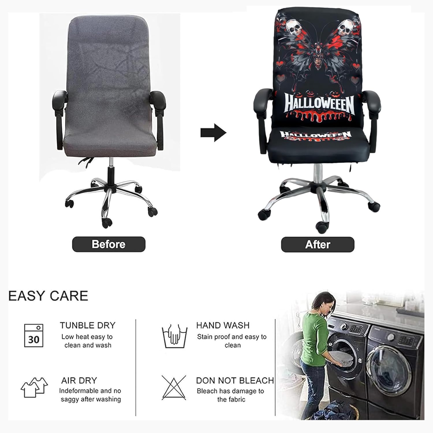- Halloween HOLIDAY DECORTAION DESIGN. Multiple Halloween patterns for choices such as spider, spider web, pumpkin, ghost, terror Bloody Handprint and so on. It refurbish old office chair and durability to add new life to your computer chairs. It's easy to create a Halloween atmosphere.