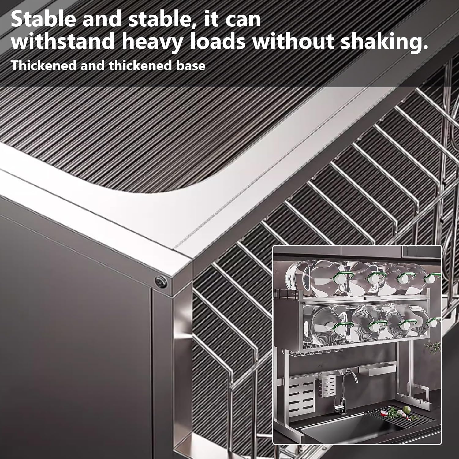 - High-Quality Material & Strong Load Capacity:The kitchen sink organizer and multifunctional countertop dish drying rack is made of premium 304 stainless steel, offering a sturdy and durable structure. The sink dish rack has a load capacity of up to 45kg/100lbs, ensuring stability without tilting. The base is equipped with four rubber suction cups to prevent shaking during use, ensuring safety and stability.